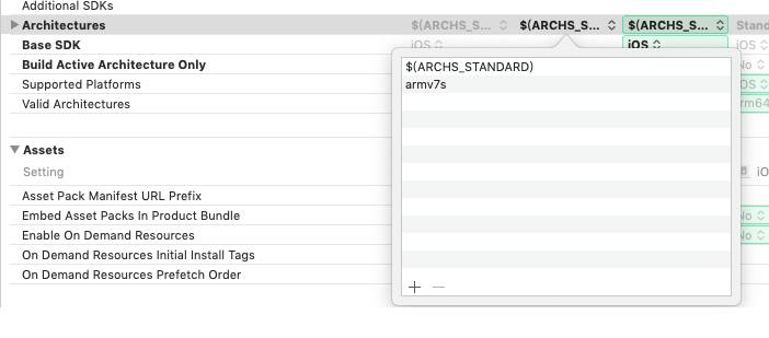 更改参数,在Architectures下增加armv7s,并选中。将Build Active Architecture only设置为NO