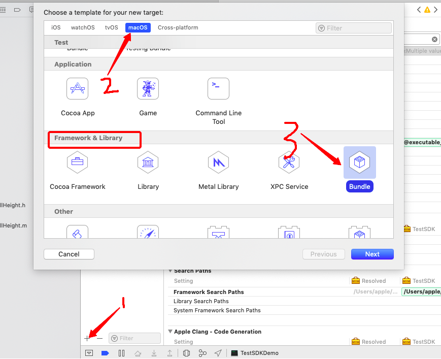 1.在target中点击右下角的+号,选择macOS,找到Framework&Library,选择Bundle。如图: