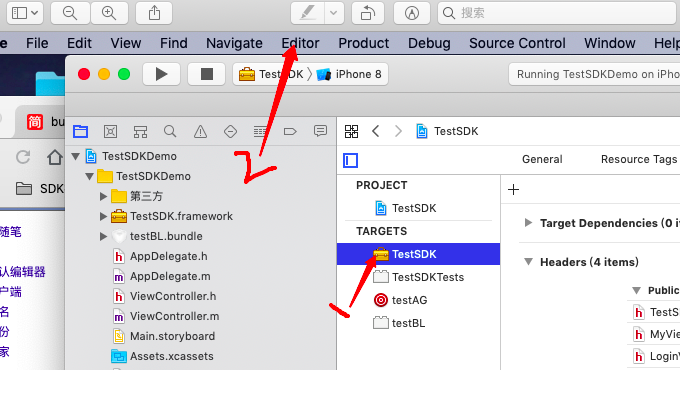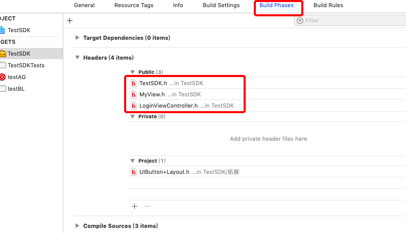 然后需要在TestSDK.h(必须是公开的,否则无法引用)中将所有要公开的.h引入引入头文件