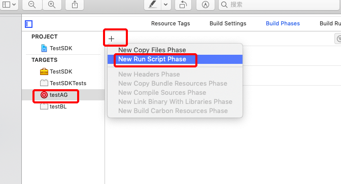 2.嵌入脚本,选中刚刚创建的Aggregare,然后选中右侧的Build Phases,点击左边的+号,选择New Run Phases。如图: