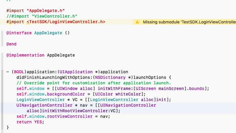 1.导入头文件,(解决警告:在TestSDK.h文件中添加公开的头文件,如#import <TestSDK/LoginViewController.h>,就可以消除警告。)