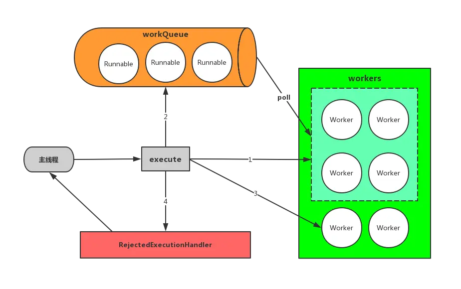 上图第2步,任务进入workQueue, 如果队列为空且有空闲的Worker的话,可马上得到执行。