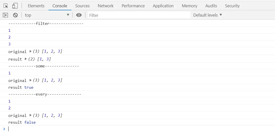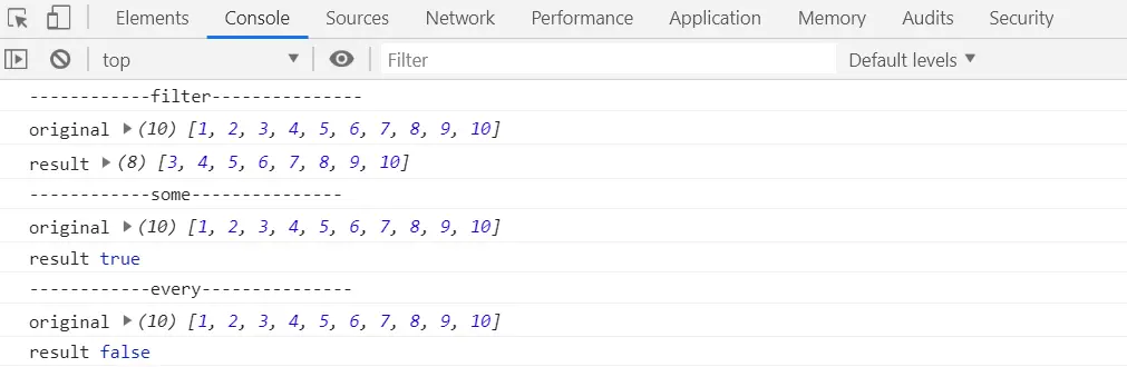 结果:filter不会提前退出循环,只是当return为false时,相应的项不会出现在新返回的数组里面,而some和every都有可能提前退出循环,当some遇到 return 为true时立马退出循环,every遇到 return为false时立即退出