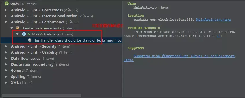 对可能引起泄漏的编码,Lint 都会进行温馨提示: