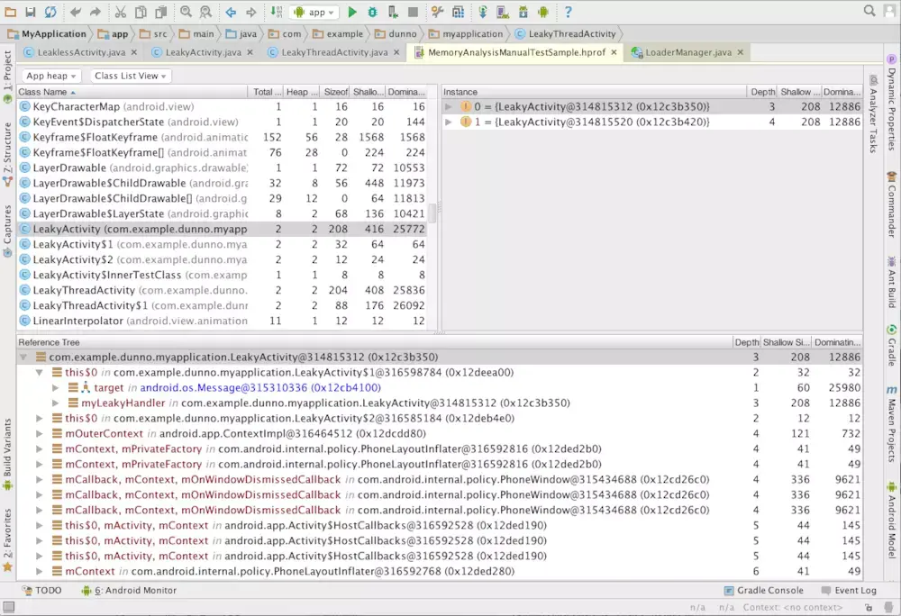 Reference Tree代表指向该实例的引用,可以从这里面查看内存泄漏的原因,Shallow Size指的是该对象本身占用内存的大小,Retained Size代表该对象被释放后,垃圾回收器能回收的内存总和。