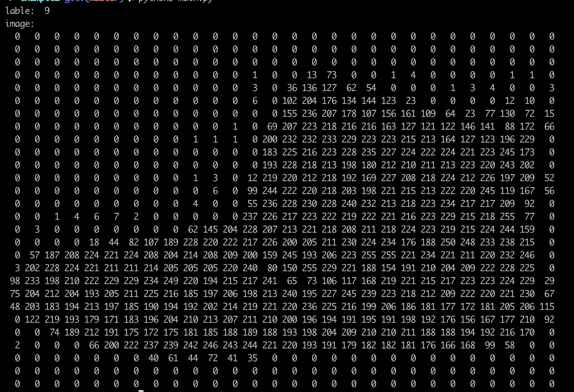 这个数据长的是什么样子呢?我们可以随便找一个元素打印出来图像数据和标签看下,这里打印下第一个元素。