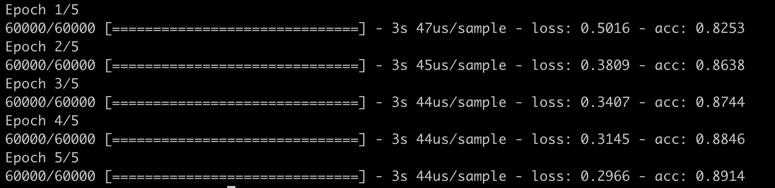 当训练完成后,我们可以看到模型的acc,就是0.8914这个数字。这个数字的含义是,我们的模型预测训练数据时,有89%的数据是准确的。这个指标不算好,但是考虑到我们只训练了5个epoch,且很快完成了训练,这个结果也是不错的了。