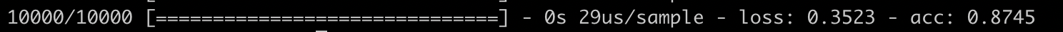 但是我们的模型在未见过的数据中表现如何呢?这就是上面的测试数据的用处了。我们可以调用model.evalute,把测试数据和标签传过去,就能看到其在测试数据上的表现了。