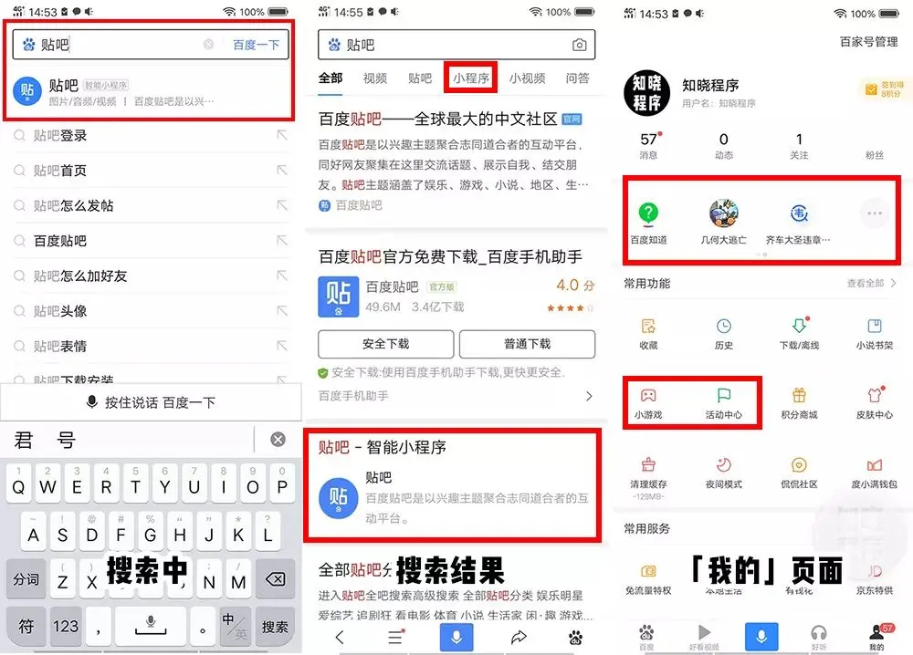 可以从百度 app 的搜索栏联想、搜索结果、底部菜单「我的」中进入百度智能小程序。