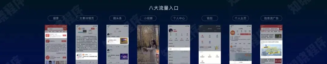 今日头条文章详情页、微头条、小视频、搜索等入口均为今日头条小程序入口,新版今日头条「常用」底部导航栏还在内测一个类似小程序桌面的新界面。而在其他平台,抖音短视频左下角也有对应的小程序入口。