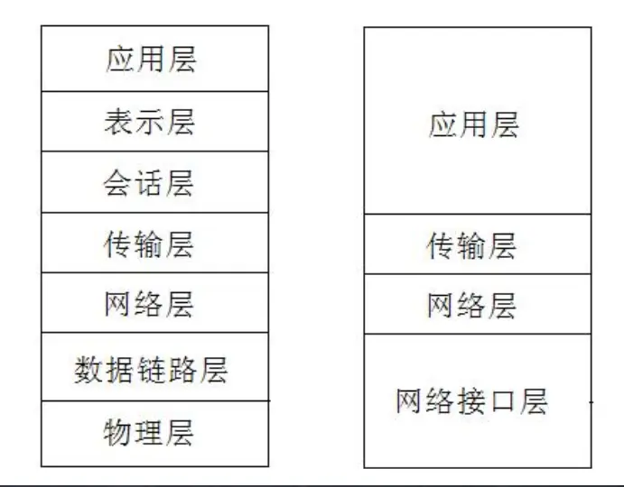 协议栈是分层的 下图中 左图为 ISO/OSI 协议 这是一种建议规范 右图为TCP/IP协议 这是一种事实协议