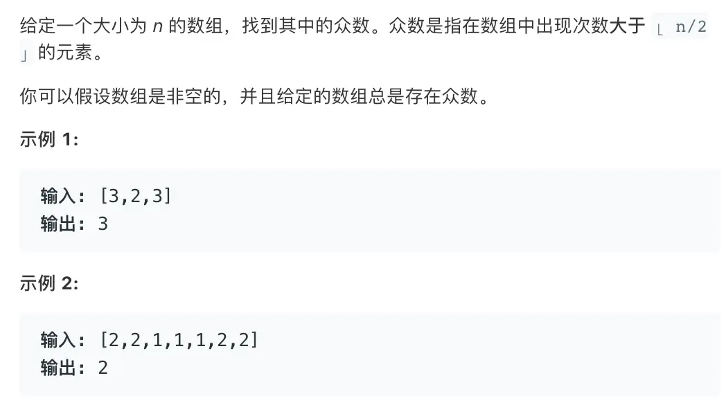 就是这个数在nums中出现次数过半,那么不管如何抵消,最终终会使c等于这个众数,t>=1。时间复杂度O(n),空间复杂度O(1),代码如下: