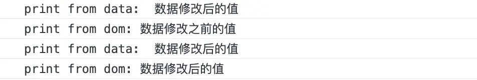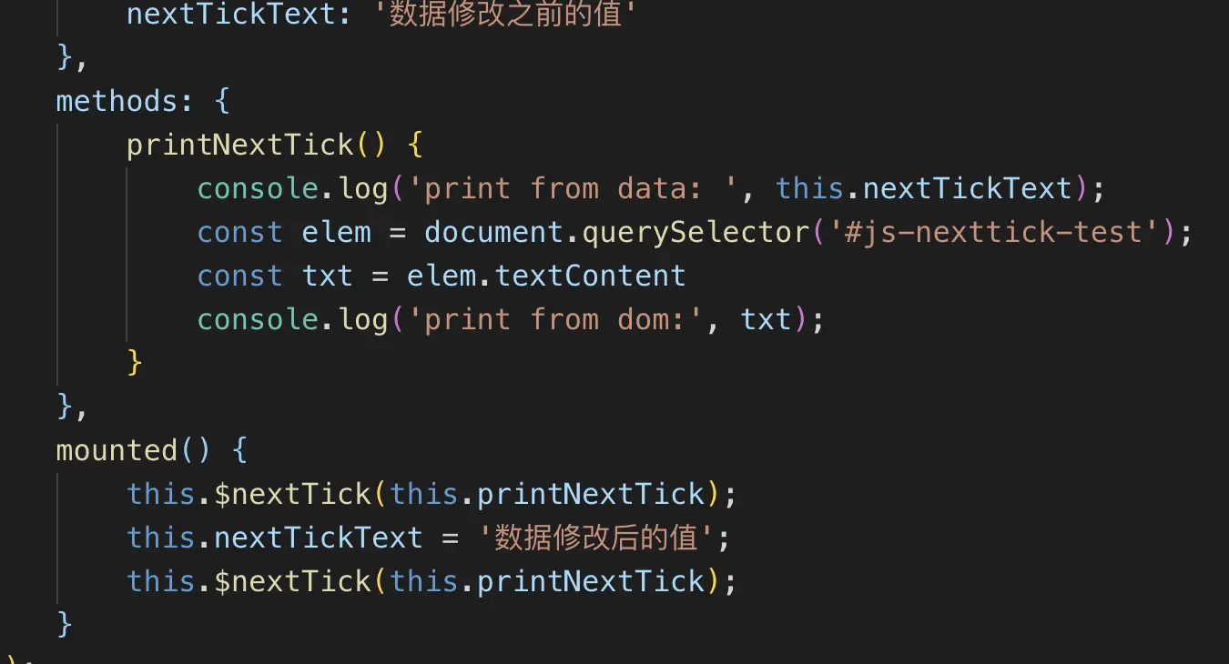 由于数据修改是同步的操作,而视图更新是异步的,所以我们两次打印data.nextTickText都是修改后的值,而视图更新是异步的,由于第一个nexttick回调在视图更新回调函数fulshSchedulerQueue之前添加,所以此时读取到的是视图更新之前的值。我们通过断电跟踪也可以看出此轮事件回调里面保存的三个函数最终会分别执行printNextTick、flushSchedulerQueue、printNextTick