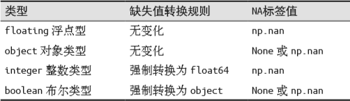 - pandans把NaN和None看成是等价交换,自动将None转换为NaN;将没有标签值得数据类型自动转换成浮点数缺失值NA