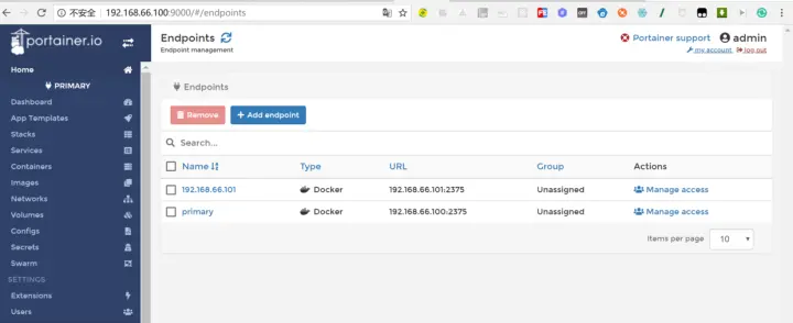 docker run -d -p 9000:9000 portainer/portainer -H tcp://192.168.66.103:2375- 功能页面
