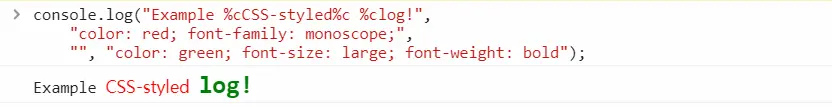 上面的例子使用了 %c 指令。 正如你所见,样式应用于 %c 指令后面的所有内容。通过使用另一个 %c 指令来闭合样式的使用。如果要使用普通的,无格式的日志内容,则需要为 %c 传递一个为空的字符串。需要注意的是,提供给 %c 指令以及其他替代字符串的参数需要以正确的顺序添加。😉