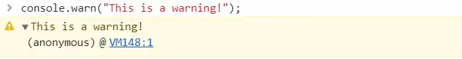 console.warn() 的效果和 console.log() 一样,但是它会有类似警告的样式效果。在大多数的浏览器当中,它显示为黄色的文字并且提示一个警告符号 ⚠。同时,在默认情况下,console.warning() 也会打印执行路径,这样可以快速地找到警告的来源。