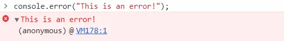 与 console.warn() 类似,console.error() 方法也会打印带有执行路径的消息,消息的样式也是特殊的。它通常是红色的,并且添加了错误图标❌。这样可以清楚地通知用户这里有某些可能错误的代码。这里值得注意的是,console.error() 方法只是打印一个控制台消息,它是没有任何附加效果的,比如停止代码的执行(所以这里你可以抛出一个错误)。这是一个简单的说明,因为许多初学者可能会对这种特性感到有些困扰。