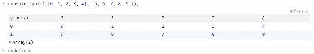 console.table([[0, 1, 2, 3, 4], [5, 6, 7, 8, 9]]);