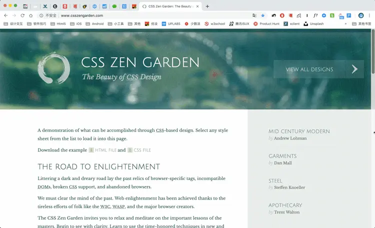 一个是全局响应,网站在手机、平板、电脑三端都会显示不同的效果。这里举CSS禅意花园这个例子 www.csszengarden.com/。看下图,随着浏览器宽度的变化,页面分别从电脑端过渡到平板,最后过渡到手机,确保在任何设备中都完美展示。