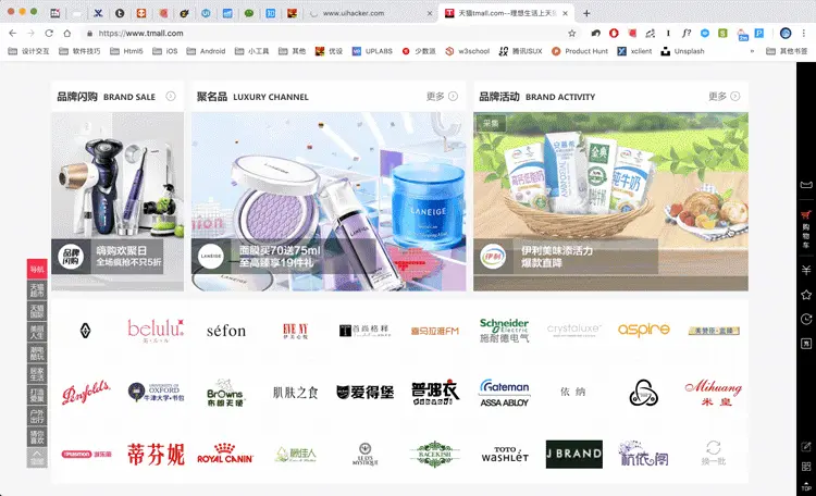 一个是非全局响应,在电脑端会有响应效果。这里举天猫的例子www.tmall.com/。看下图,随着浏览器宽度变化,宽屏和窄屏会有内容上的区别,其中左侧的品牌闪购这一列在小屏幕电脑上会消失,所以在小屏幕电脑上不会出现水平滚动条,内容得以完整呈现。不过再缩小下去不会变成手机界面,天猫有自己独立的手机网页端,所以和上面例子相比不是全局性的。