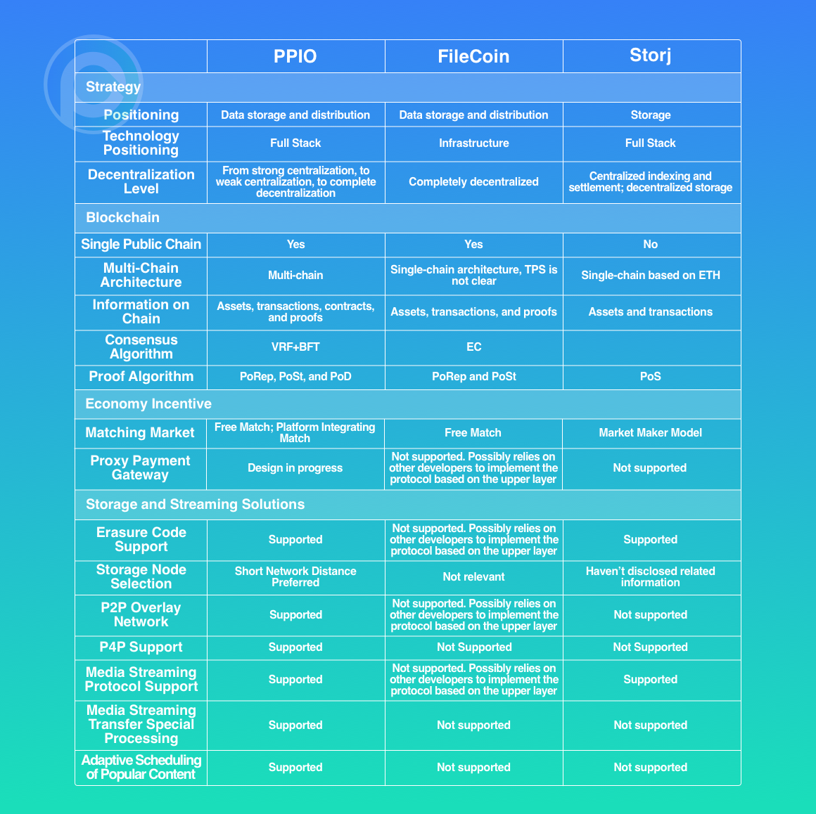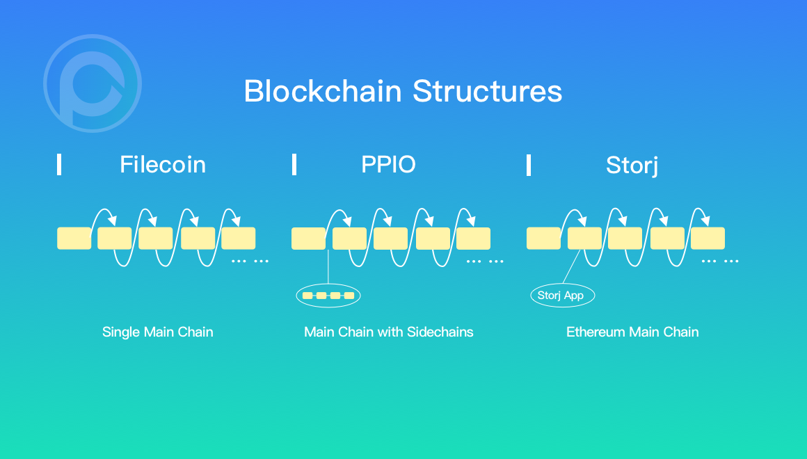 Storj 仅使用 ERC20 的 Token 来标识其存储节点的贡献,而平台本身没有区块链的支持。因此其客户端(Client/User)与存储节点(Storage Node/Miner)之间的交易是通过中心化的服务节点(Satellite)来完成。因此严格的说,Storj 并不是一个公链项目,是基于以太坊上一个应用。Filecoin 和 PPIO 则都拥有自己的链,并且不仅实现了价值在链上的流通,而且交易和证明也在链上完成,是真正意义上的基于区块链的存储和分发平台。