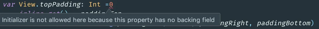 如果我们从Java 的角度去看一个没有 backing field 的 property,可以理解为 Kotlin 对 以get、set开头这样的函数的语法糖,这种语法糖有什么用呢?个人觉得是为了DSL语法服务的,还是以上面那个topPadding为例,当你在用 DSL 语法设置一个view的时候,比如: