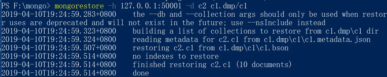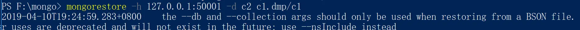 mongorestore -h 127.0.0.1:50001 -d c2 c1.dmp/c1