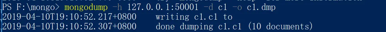 mongodump -h 127.0.0.1:50001 -d c1 -o c1.dmp