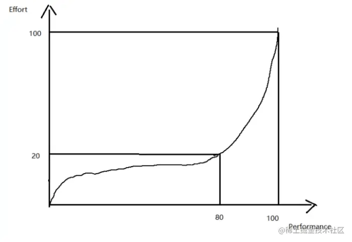 程序员总是对性能优化这个话题充满激情,好像这成了唯一彰显其技术能力的手段。确实,要把应用系统的性能优化到极致,确实要付出大量的努力。但实际上性能优化所付出的努力与取得的效果也符合二八定律。其工作量与索取的效果类似于下图所示。