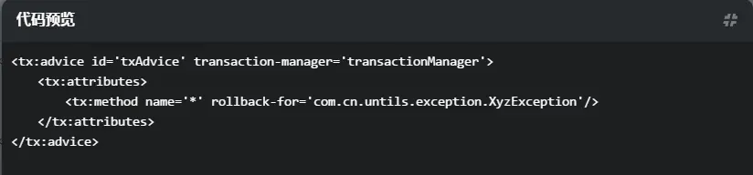 Spring的AOP即声明式事务管理,默认是针对unchecked exception回滚。也就是默认对RuntimeException()异常或是其子类进行事务回滚;checked异常,即Exception可try{}捕获的不会回滚。如果使用try-catch捕获抛出的unchecked异常后,没有在catch块中采用页面硬编码的方式使用spring api对事务做显式的回滚,则事务不会回滚。“将异常捕获,并且在catch块中不对事务做显式提交相当于生吞掉异常” ,要想捕获非运行时异常则需要如下配置: