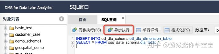如果在DMS for Data Lake Analytics控制台(datalakeanalytics.console.aliyun.com/)执行,请选择“异步执行”。