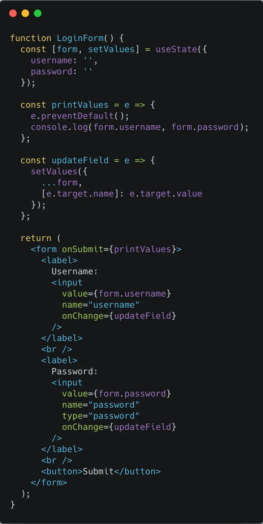 下边是一个表单,表单中有username, password两个字段。展示了如何初始化表单数据,和更新对应的字段