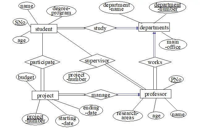 - When a student work on a project, the professor managing this project must supervise the student’s work. One student may work on several projects, so he may have several supervisors.
