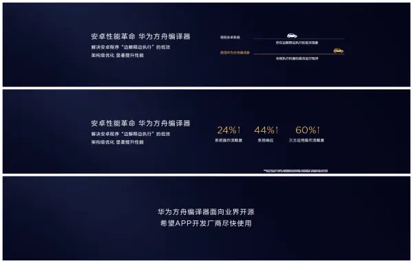 华为继去年推出黑科技 GPU Turbo 之后,今年再次扔出了一枚重磅炸弹, 安卓性能革命,华为方舟编译器,号称解决安卓程序 “边解释边执行” 的低效,全程执行机器码高效运行程序。架构级优化,显著提升性能。系统操作流畅度提升 24%,系统响应提升 44%,三方应用操作流畅度提升 60%,并承诺向业界开源。敢于开源的话,这个数据应该没有水分。大家在网上应该也看到了 P30 Pro 吊打 S10 的视频。