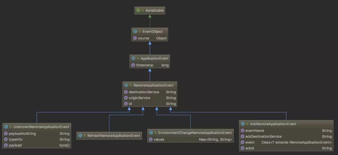Map<String,String>类型的数据并更新到 Spring 上下文中Environment中的事件。文中的实例就是使用这个事件并配合EnvironmentBusEndpoint和EnvironmentChangeListener完成的。AckRemoteApplicationEvent: 远程确认事件。Bus 内部成功接收到远程事件后会发送回