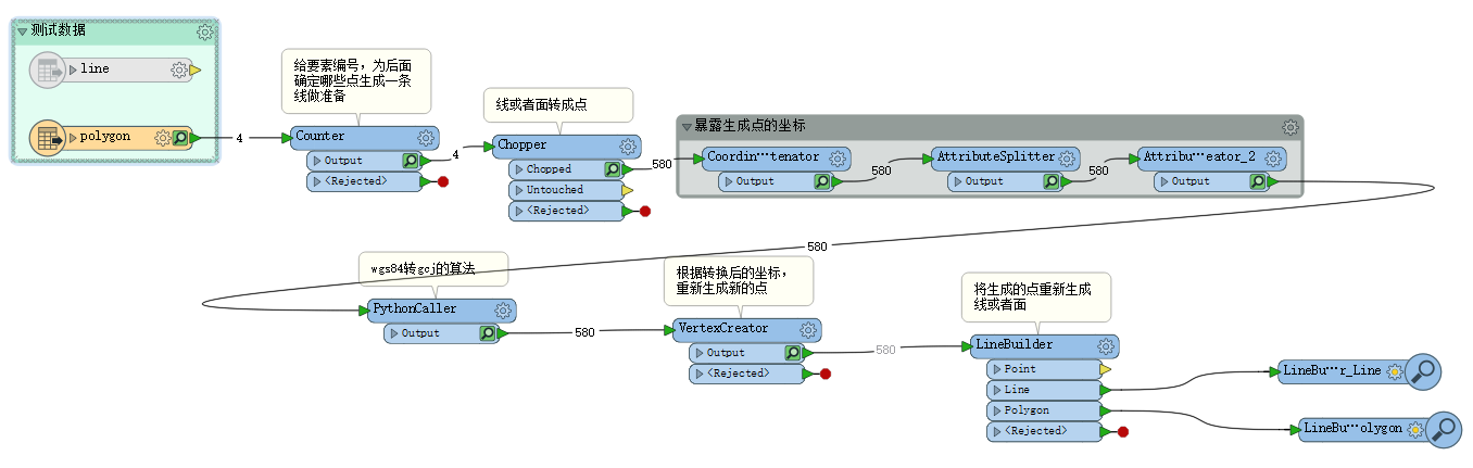 由于我国特殊国情,公众版地理信息服务(包括电子底图)都要进行各种坐标偏移旋转等数据加密处理(火星坐标系),并获取国土资源部数据审查并颁发审图号才可公开发布。目前流行的互联网地图基本都是用的火星坐标系,而百度地图是在火星坐标系的基础上进行二次加密,形成自己的bd09坐标系。企业的GIS数据都是通过传感器或者实地测量获得的非加密的WGS84坐标(即常用的gps那种坐标),当企业将自己的业务数据叠加到互联网底图时,不可避免出现图层叠加偏移问题。网络上关于坐标相互之间的转换的算法都有公开(可自行百度),但是这些算法基本都是基于点的坐标进行转换的,对于比较复杂的线或者面,每一个要素都又许多个坐标点构成。 FME作为业内非常强大的数据转换和处理工具,基本可以实现零代码实现各种数据相互的复杂处理。因此基于FME写了一个转换模块,实现复杂要素的批处理。核心是pythoncaller中的转换算法。下面是FME模块的截图: