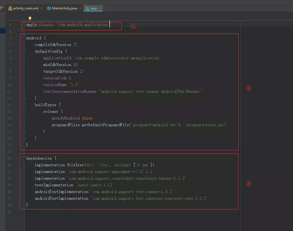 - implementation 'com.android.support:appcompat-v7:27.1.1':implementation语句为 远程依赖声明,'com.android.support:appcompat-v7:27.1.1'为一个标准的远程依赖库格式,其中com.android.support为域名部分,用于区分不同公司的库;appcompat-v7为组件名称,用于区分同一个公司的不同库;27.1.1为版本号,用于区分同一个库的不同版本。加上这句声明后,Gradle在构建项目时会先检查一下本地是否已经缓存过该库,若没有缓存则自动联网下载,下载后自动添加到项目的构建路径中去。