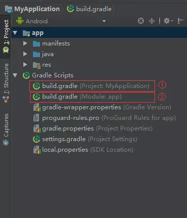 Android Studio是采用gradle来构建项目的,gradle是基于groovy语言的,如果只是用它构建普通Android项目的话,是可以不去学groovy的。当我们创建一个Android项目时会包含两个Android build.gradle配置详解文件,如下图: