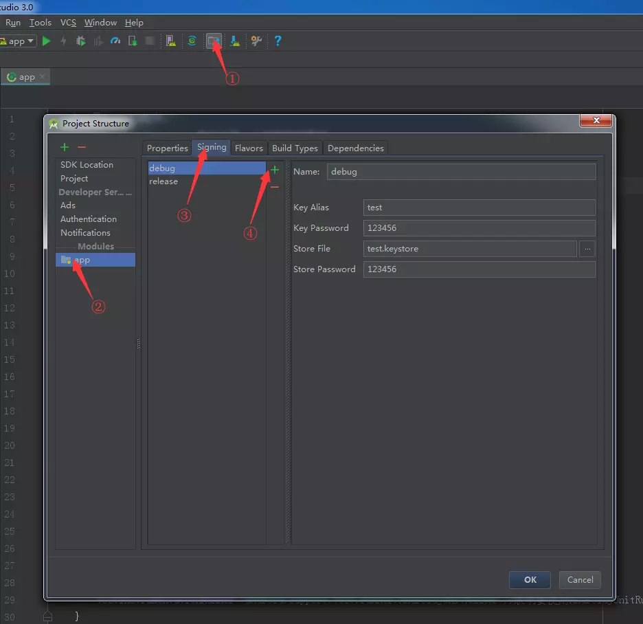可以手动添加签名配置,也可以通过Project Structure 选中app,点击Singing添加,具体步骤如下图所示: