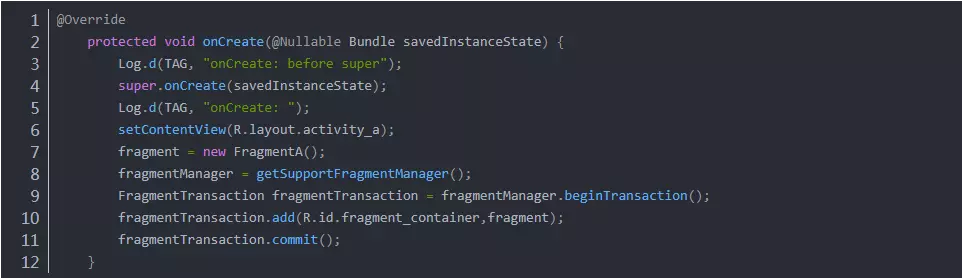 回过头来看ActivityA中的onCreate()添加Fragment的写法对不对,我们通过上面的研究,发现在手机内存降低,被系统杀死之前,Fragment相关的信息会由系统帮我们保存,再次打开App时候,就可以直接在onCreate(@Nullable Bundle savedInstanceState)的参数中取,如果还是按着上面的那种写法,会重复添加Fragment。这势必造成内存的消耗,资源的浪费等一些列问题。所以正确的写法如下:
