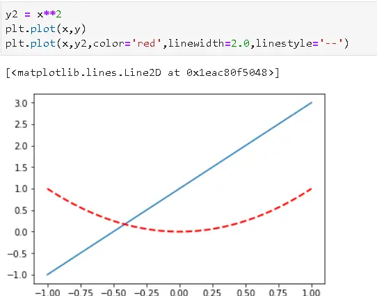 plt(x,y2,color='red',linewidth=1.0,linestyle='--')#可选参数:color选择颜色,linewidth线宽,linestyle线的形式