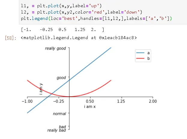 plt.legend(loc='best',handles=[l1,l2,],labels=['a','b'])