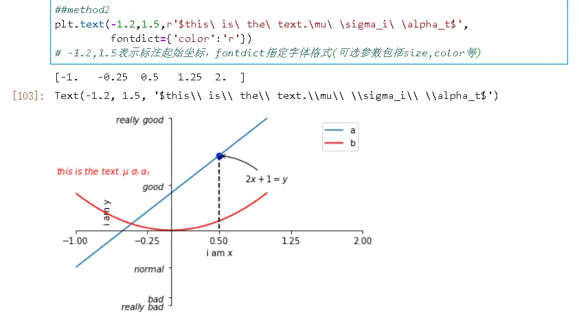 plt.text(-1.2,1.5,r'$this\ is\ the\ text.\mu\ \sigma_i\ \alpha_t$',