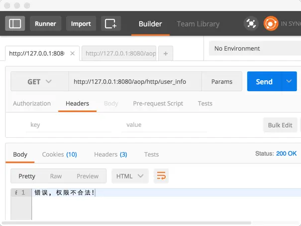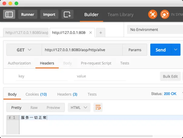 首先在 Postman 中, 调用 /aop/http/alive 接口, 请求头中不加任何参数: