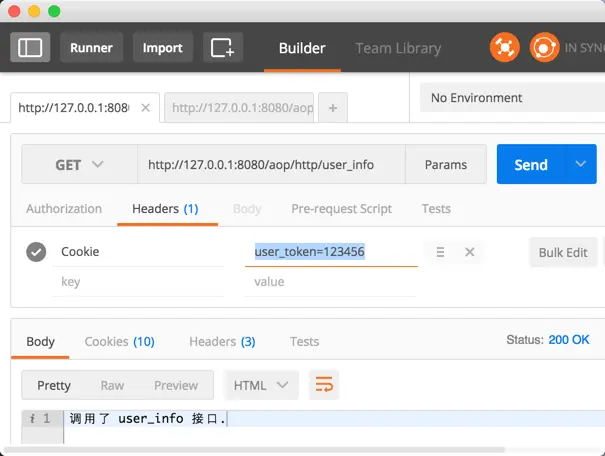 那么为了能够正常地调用 /aop/http/user_info 接口, 我们可以在 Cookie 中添加 user_token=123456, 这样我们可以愉快的玩耍了: