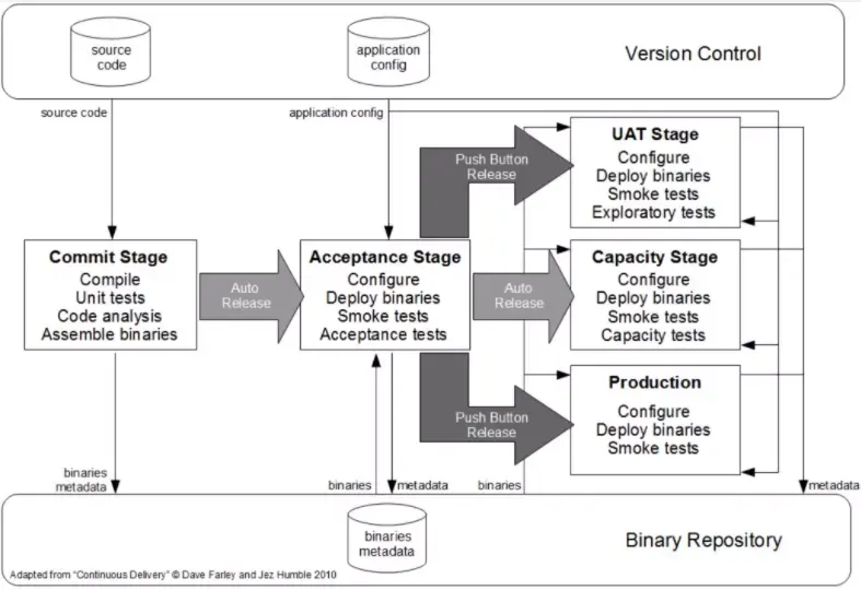 以上的每一个阶段都是交付流水线的一部分。 Humble 和 Ferley 在他们的书作《持续交付:通过自动化构建、测试和部署实现可靠软件版本发布》中解释说: "对软件的每次更改都要经过一个复杂的过程才能发布,该过程包括多个测试和部署阶段进行软件的构建。 反过来看,这个过程需要许多人之间的合作,甚至可能需要几个团队间合作。 部署流水线对这一过程进行建模,并且它的持续集成和发布管理工具能让您在代码从版本控制转移到各种测试和部署时, 查看和控制每次更改的过程。"