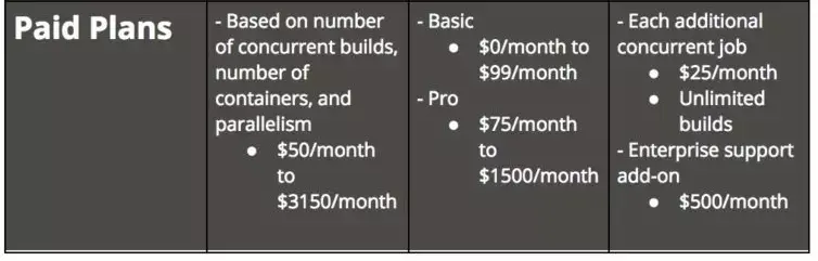 在 mabl 中,我们在 Google Cloud Platform 上进行构建, 因此,我们正在寻找与 GSP 兼容或者最好是已经集成进 GSO 的产品。我们尝试过 CircleCI,Codeship 和 Shippable, 下面有一个简单的表格,展示了每个工具的一些细节: