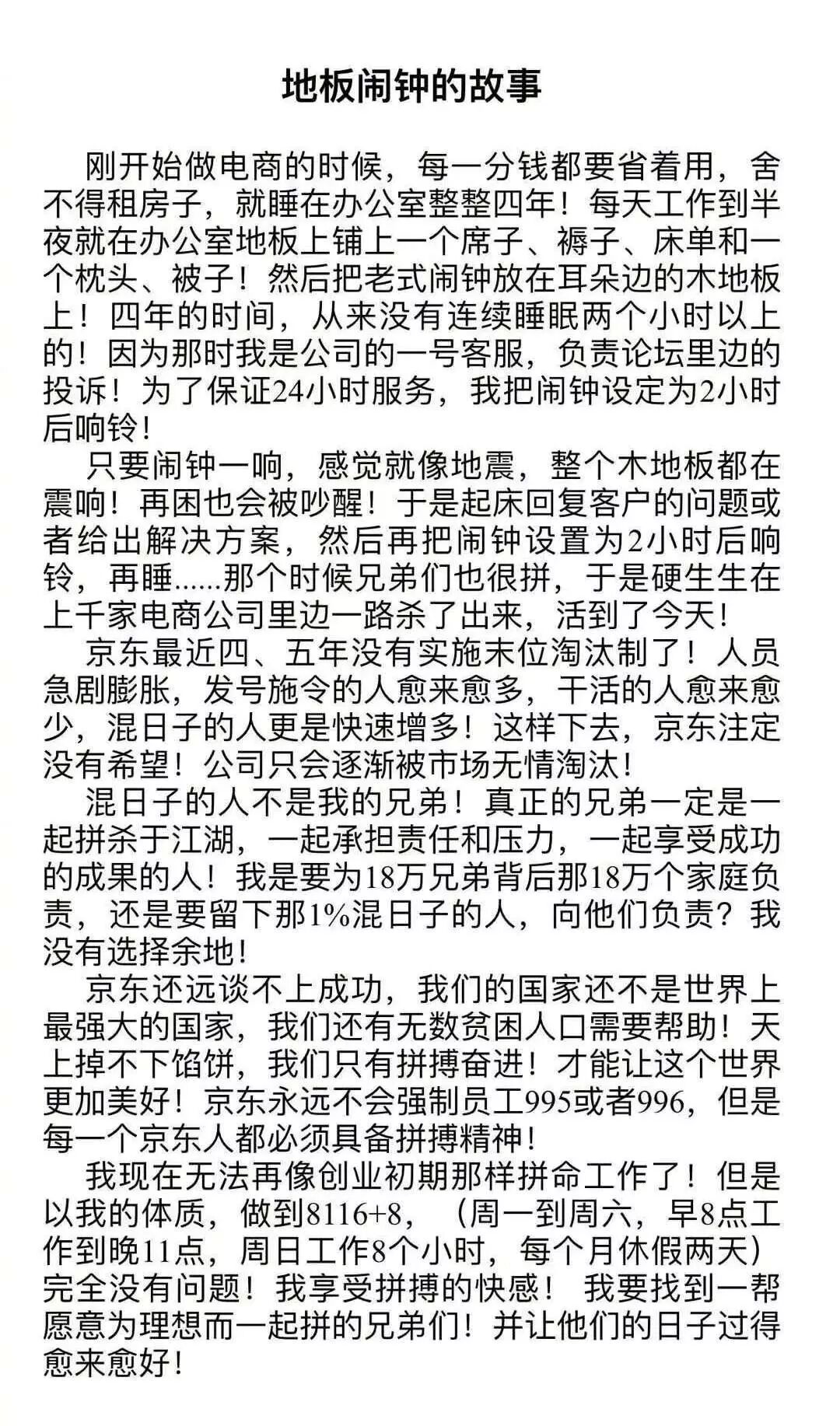 另一家电商巨头京东今年的日子也不顺利。在接连爆出:优化掉10%的高管,撤回应届生Offer,取消快递员基础工资,降低员工公积金比例,淘汰掉三类人,离职排队达400人等新闻后。今天东哥又讲了个地板闹钟的故事。
