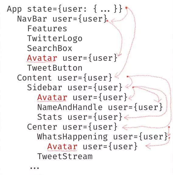 为了把 user 数据传递给全部 3 个 Avatar 组件,必须要经过一堆并不需要该数据的中间组件。